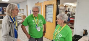 Il est important que le Tour paie correctement tous les repas qui sont servis. Une équipe dédiée note tous les repas servis. Beaucoup de jeunes sont bénévoles au Tour, mais la photo démontre qu’un certain nombre de « têtes grises ou blanches » apportent aussi leur contribution, année après année. Ici, France et Pierre Galarneau discutent avec Marie Diane Bessette sur la manière de bien noter les informations utiles. Plus tard, les « trois mousquetaires » aideront La Sandwicherie à préparer les boites à lunch pour le diner de dimanche, car les coureurs quitteront Val-d’Or pour Senneterre vers 11 h 45. La septième et dernière étape du Tour partira de Senneterre à 14 heures en direction de Val-d’Or où le groupe effectuera 10 tours de 5,2 km en circuit fermé. Cette portion de l’étape intéresse particulièrement le public.
